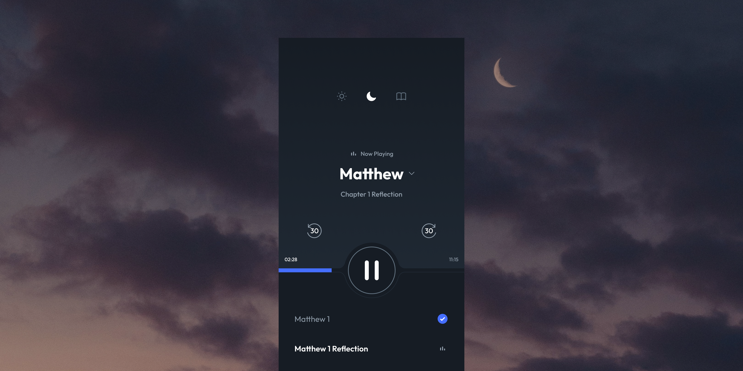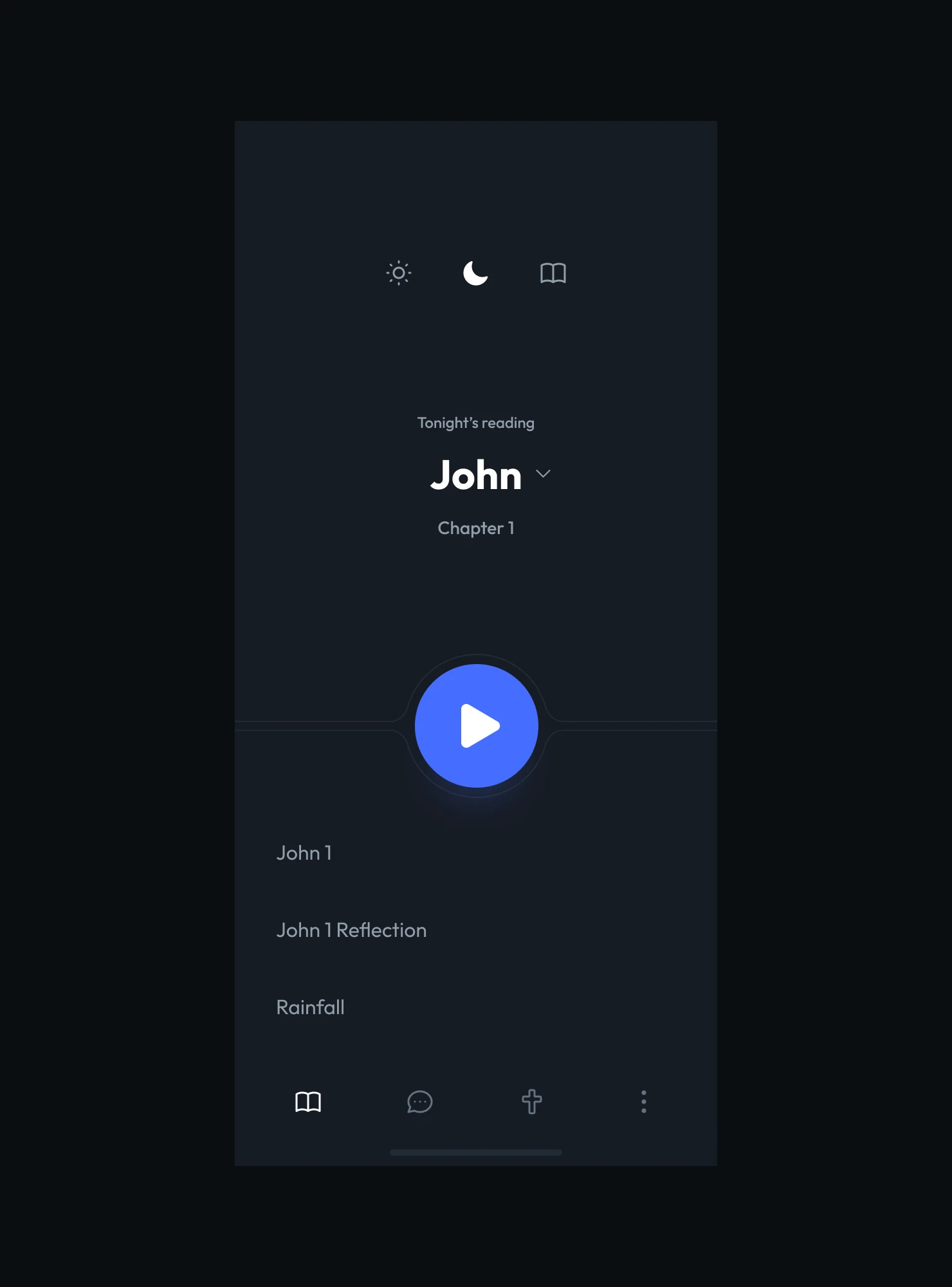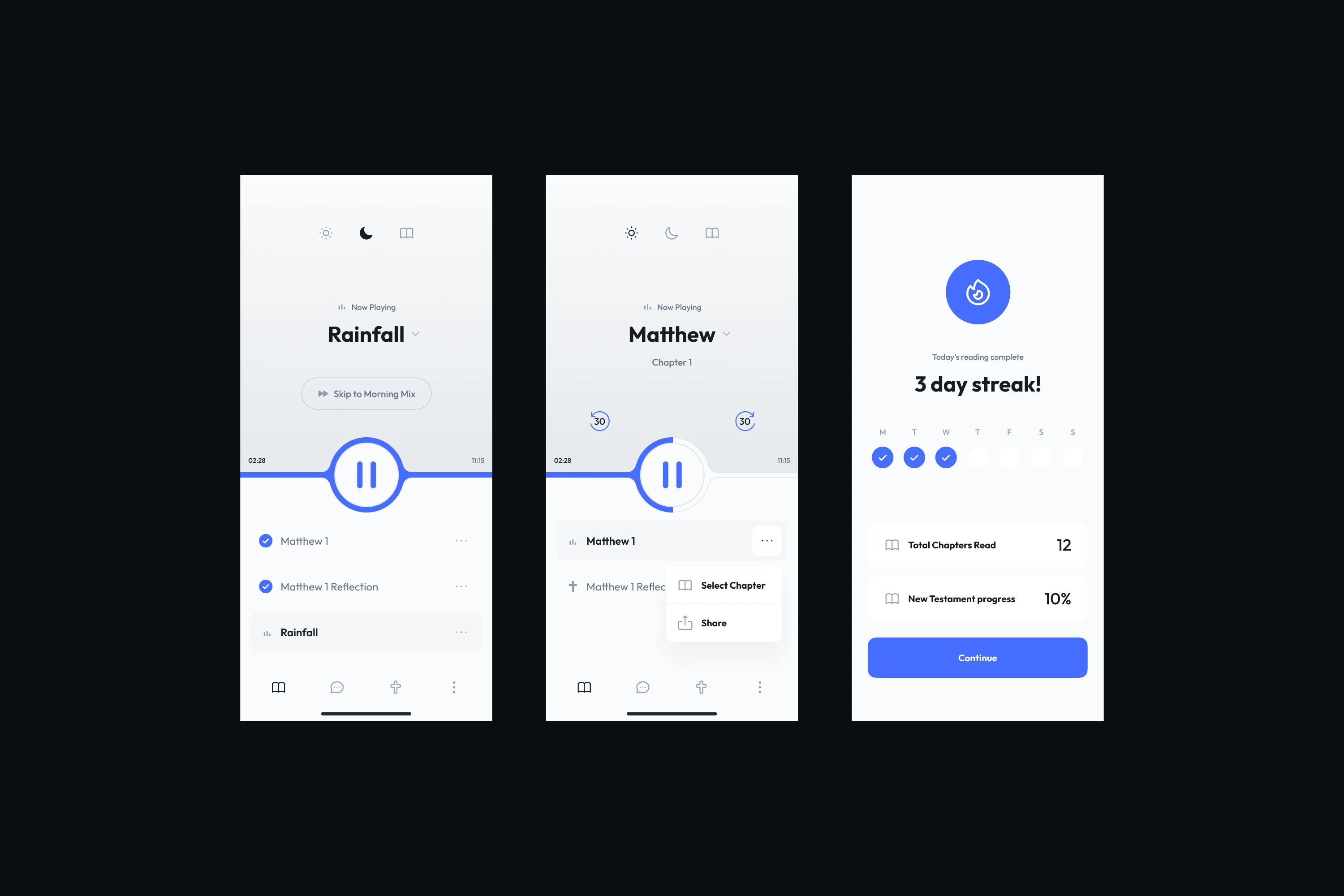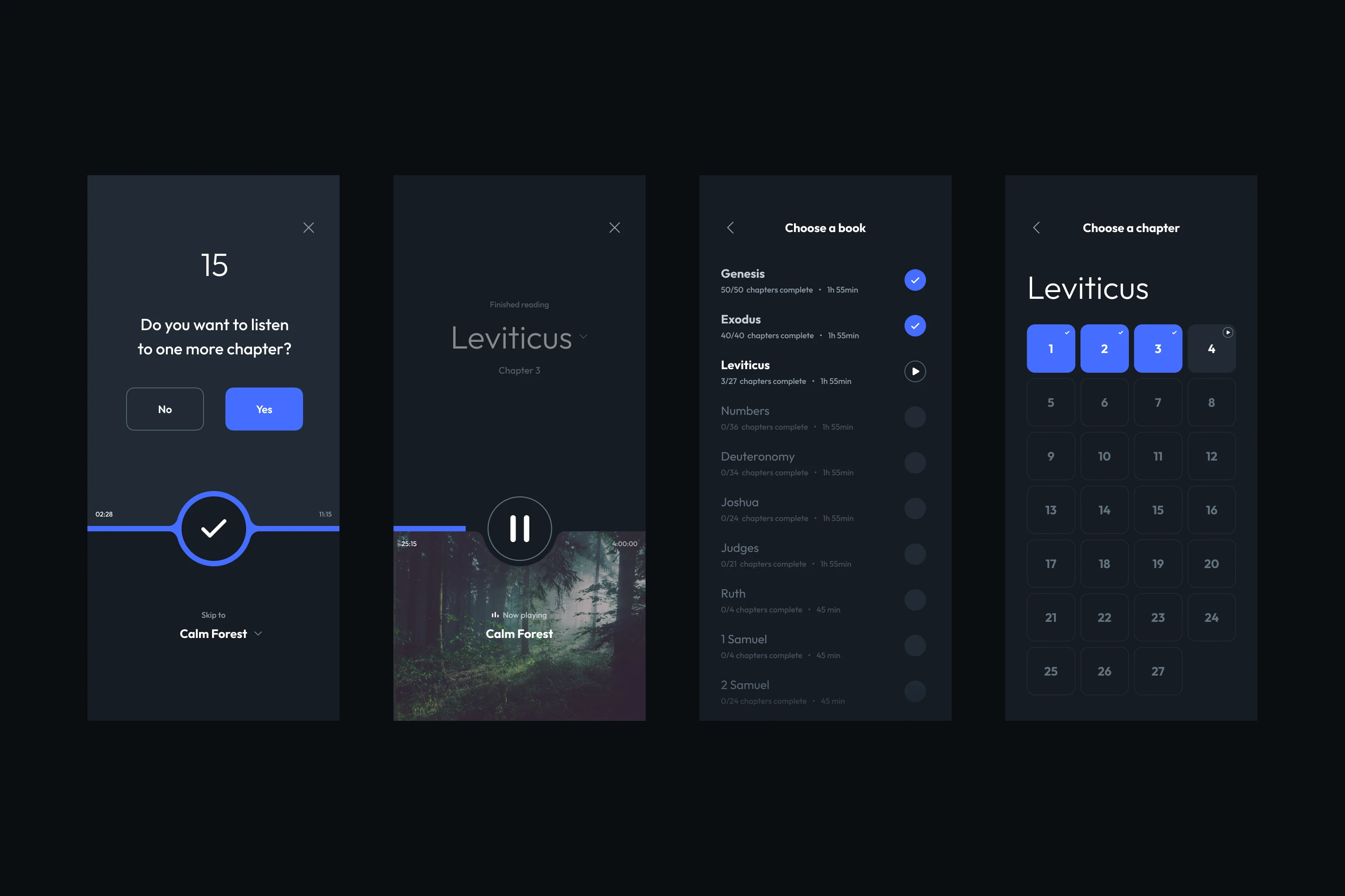 App designed to guide users through the entire Bible with nightly and morning sessions. I was responsible for the product design, focusing on creating a seamless user experience that integrates Bible readings, meditations, and customizable sleep sounds.